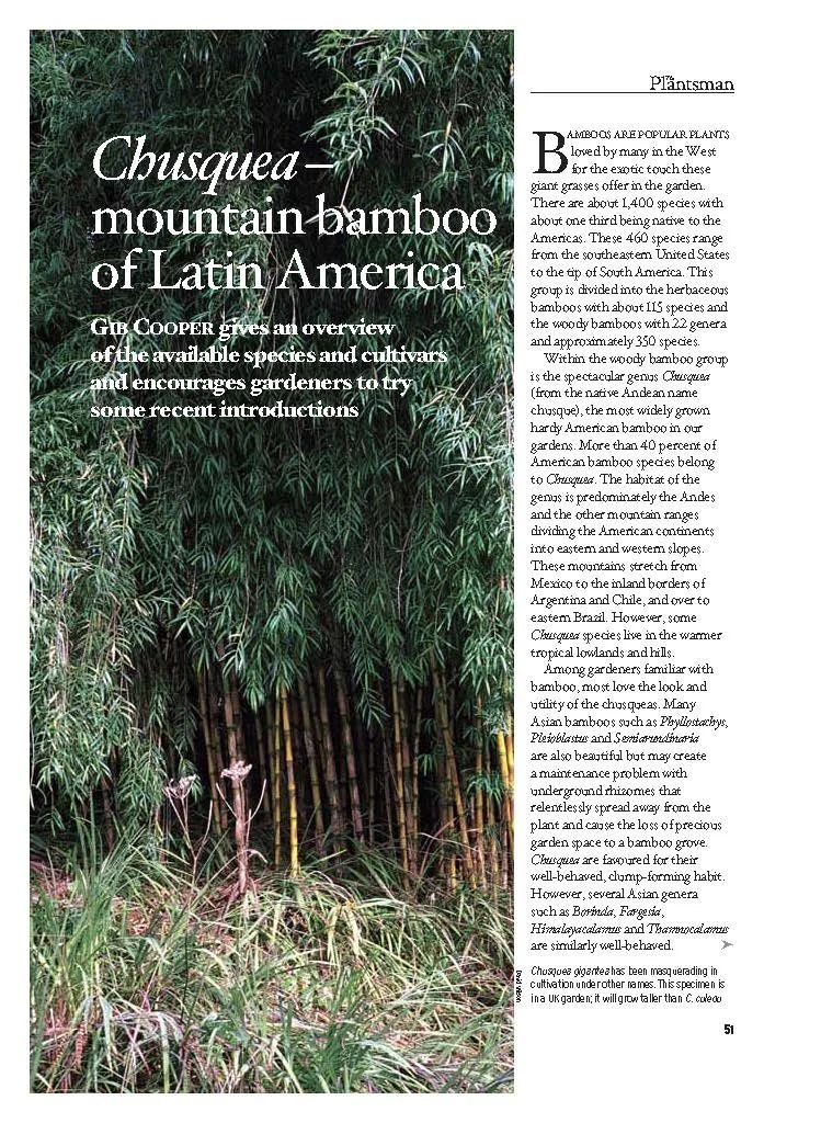 This comprehensive article by Gib Cooper profiles the genus Chusquea, a group of clumping, woody bamboos native to the mountainous regions of Central and South America. Cooper explains the genus's botanical traits, diversity, and horticultural appeal—especially in cool, maritime climates like the Pacific Northwest and the UK. The piece includes detailed descriptions of key species such as Chusquea culeou, C. gigantea, and C. andina, along with lesser-known and more tender species. It also addresses taxonomy challenges, cultivation practices, propagation methods, and conservation efforts through organizations like BOTA. With vivid imagery and first-hand insight, the article encourages gardeners to consider these elegant and often underutilized bamboos for temperate landscapes.